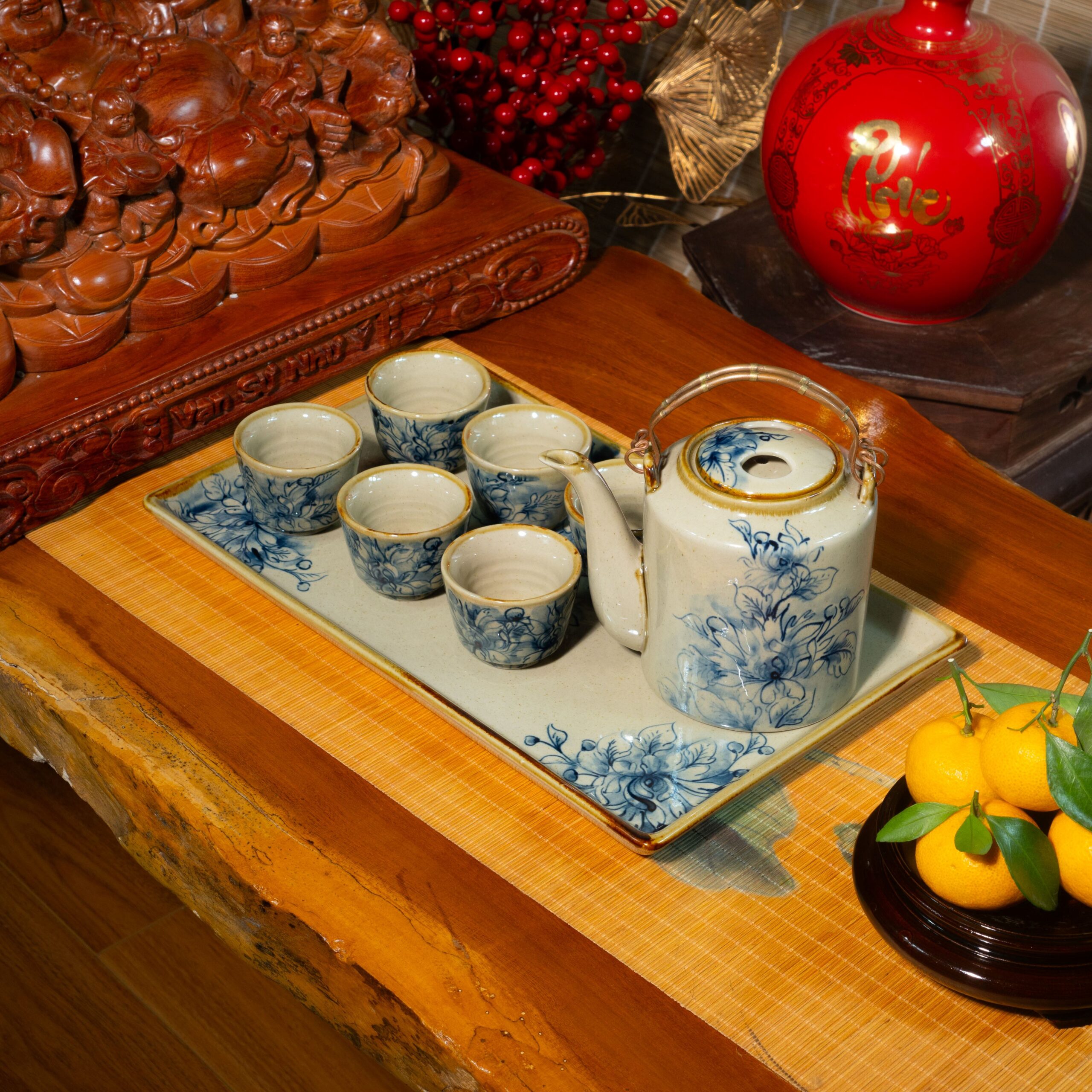 - Chất liệu và màu sắc: Bộ ấm chén được làm từ đất sét cao cấp, nung ở nhiệt độ cao (khoảng 1200-1300°C), tạo nên độ bền chắc và khả năng giữ nhiệt tốt. Lớp men tro trắng ngà bóng mịn phủ bên ngoài làm nổi bật họa tiết xanh lam, kết hợp với viền vàng nâu ở miệng ấm, miệng chén và khay đựng, tạo nên vẻ đẹp cổ điển và tinh tế. Màu sắc hài hòa giữa trắng ngà, xanh lam và viền vàng nâu mang lại cảm giác ấm áp, trang nhã.