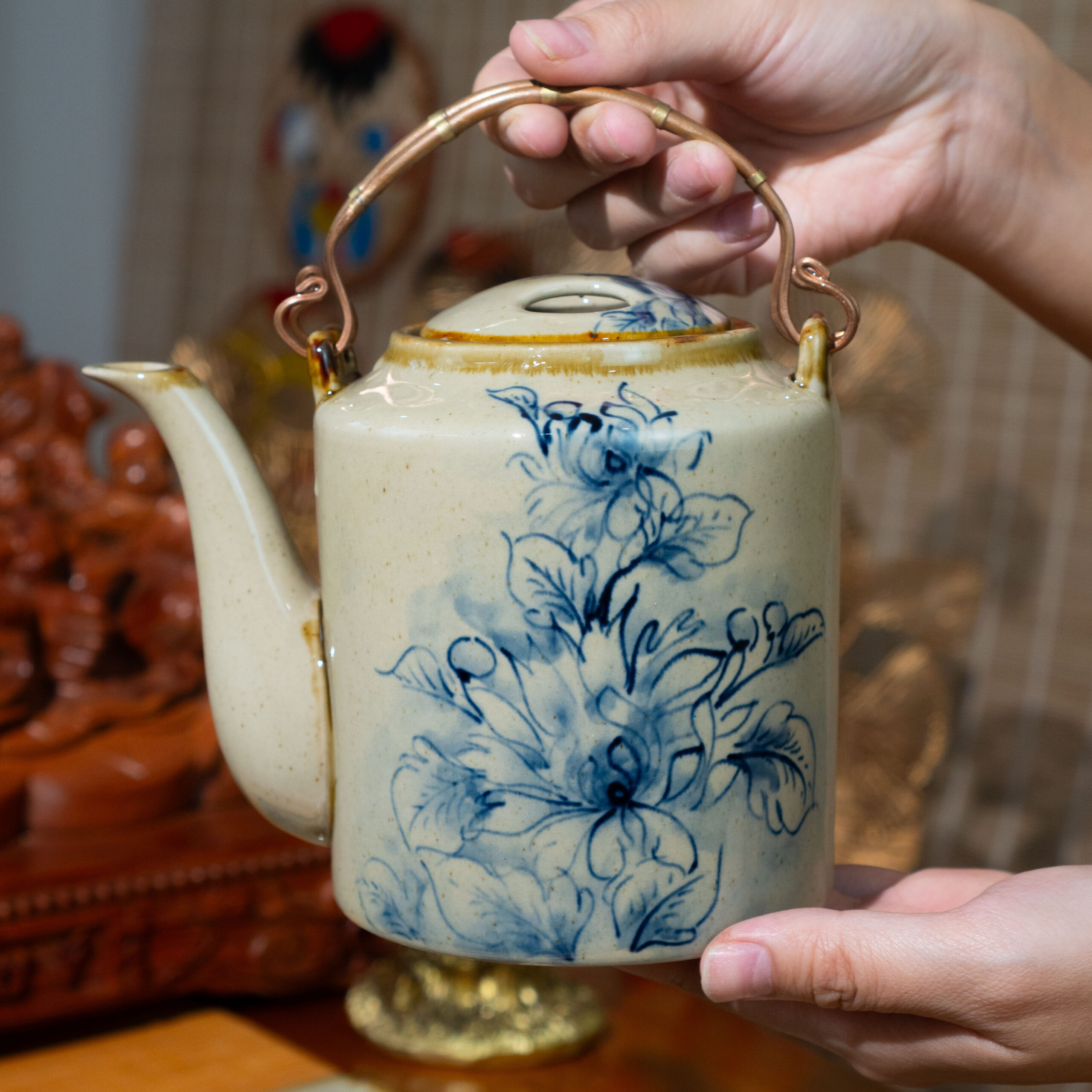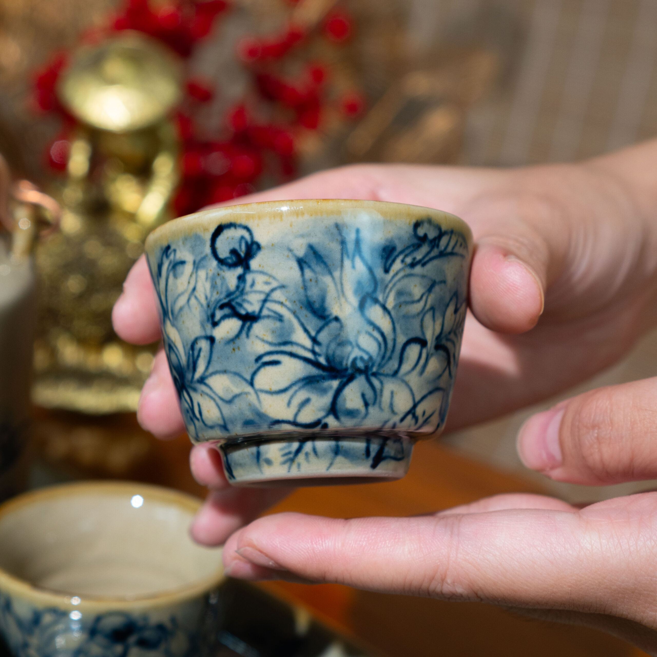 - Thiết kế và họa tiết: Bộ ấm chén được trang trí bằng họa tiết hoa cúc cổ, vẽ tay tỉ mỉ bằng màu xanh lam trên nền sứ trắng ngà tinh khôi. Hoa cúc được vẽ với những cánh hoa mềm mại, xen kẽ lá xanh, tạo nên một tổng thể hài hòa, thanh thoát. Họa tiết này mang phong cách cổ điển, gợi nhớ đến những bộ sưu tập gốm sứ thời xưa, vừa mộc mạc vừa sang trọng. Ngoài hoa cúc, các đường nét uốn lượn nhẹ nhàng của lá và cành càng làm nổi bật ý nghĩa trường thọ, bền vững.