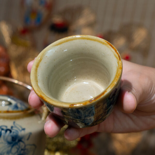 Chén trà: Bộ gồm 6 chén nhỏ, mỗi chén có dung tích khoảng 70-80ml, phù hợp để thưởng trà kiểu truyền thống. Chén có miệng loe nhẹ, thân chén tròn, họa tiết hoa cúc được vẽ đều quanh thân, mang lại cảm giác hài hòa và sống động.