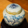 • Thiết kế và họa tiết: Hũ đựng trà được trang trí bằng họa tiết “Sơn Thủy Hữu Tình” – hình ảnh núi non, cây cối, và mây trời được vẽ tay tỉ mỉ bằng màu xanh lam trên nền sứ trắng ngà tinh khôi. Họa tiết này mang phong cách cổ điển Á Đông, gợi lên cảm giác thanh bình, gần gũi với thiên nhiên. Các đường nét vẽ mềm mại, uyển chuyển, tái hiện cảnh sơn thủy một cách sống động, thể hiện sự tinh tế và tài hoa của nghệ nhân.