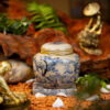 • Chất liệu và màu sắc: Hũ được làm từ đất sét cao cấp, nung ở nhiệt độ cao (khoảng 1200-1300°C), tạo nên độ bền chắc và khả năng bảo quản trà tốt. Lớp men trắng ngà bóng mịn phủ bên ngoài làm nổi bật họa tiết xanh lam, kết hợp với viền vàng nâu ở miệng hũ và nắp, tạo nên vẻ sang trọng và cổ điển. Màu sắc hài hòa giữa trắng ngà, xanh lam và viền vàng nâu mang lại cảm giác ấm áp nhưng không kém phần tinh tế.