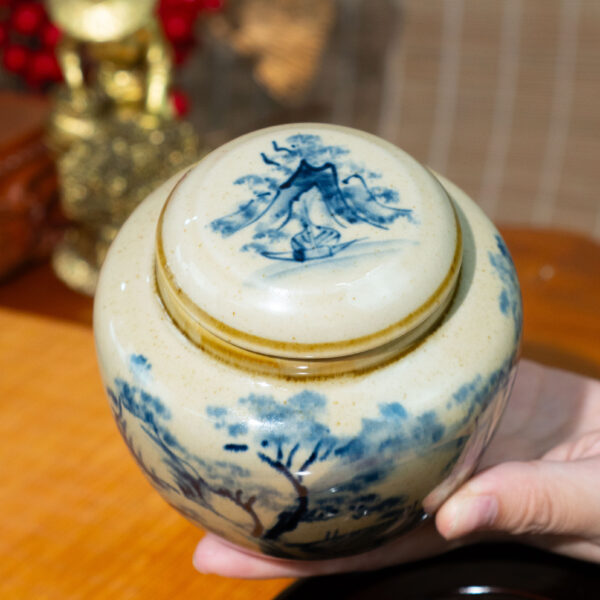 • Thiết kế và họa tiết: Hũ đựng trà được trang trí bằng họa tiết “Sơn Thủy Hữu Tình” – hình ảnh núi non, cây cối, và mây trời được vẽ tay tỉ mỉ bằng màu xanh lam trên nền sứ trắng ngà tinh khôi. Họa tiết này mang phong cách cổ điển Á Đông, gợi lên cảm giác thanh bình, gần gũi với thiên nhiên. Các đường nét vẽ mềm mại, uyển chuyển, tái hiện cảnh sơn thủy một cách sống động, thể hiện sự tinh tế và tài hoa của nghệ nhân.
