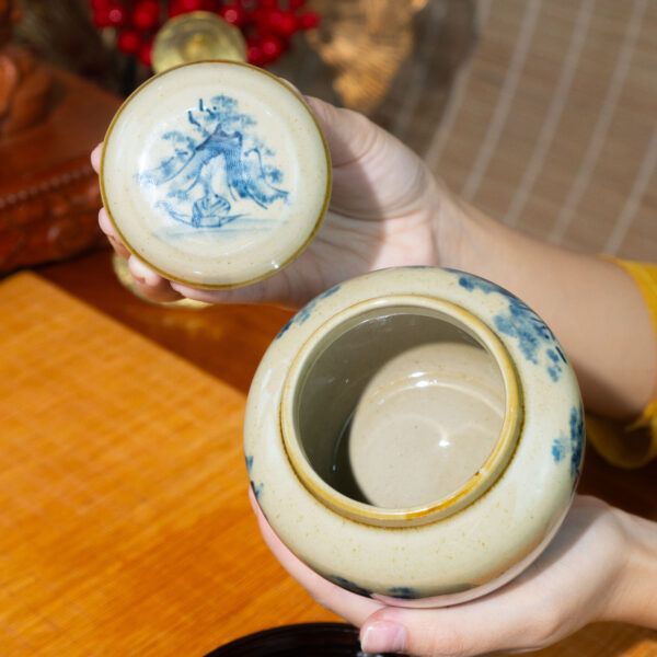 • Chất liệu và màu sắc: Hũ được làm từ đất sét cao cấp, nung ở nhiệt độ cao (khoảng 1200-1300°C), tạo nên độ bền chắc và khả năng bảo quản trà tốt. Lớp men trắng ngà bóng mịn phủ bên ngoài làm nổi bật họa tiết xanh lam, kết hợp với viền vàng nâu ở miệng hũ và nắp, tạo nên vẻ sang trọng và cổ điển. Màu sắc hài hòa giữa trắng ngà, xanh lam và viền vàng nâu mang lại cảm giác ấm áp nhưng không kém phần tinh tế.