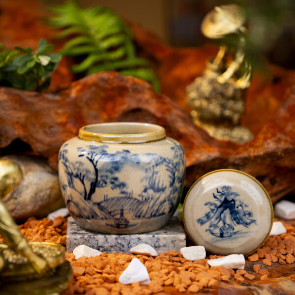 Hũ đựng trà Sơn Thủy Hữu Tình là một sản phẩm gốm sứ tinh xảo, được chế tác thủ công bởi các nghệ nhân lành nghề của làng gốm Bát Tràng, nổi tiếng với truyền thống làm gốm lâu đời. Hũ không chỉ là vật dụng để bảo quản trà mà còn là một tác phẩm nghệ thuật, mang vẻ đẹp hài hòa giữa thiên nhiên và con người, đúng như tên gọi “Sơn Thủy Hữu Tình” – cảnh núi non, sông nước đầy tình thơ ý họa.