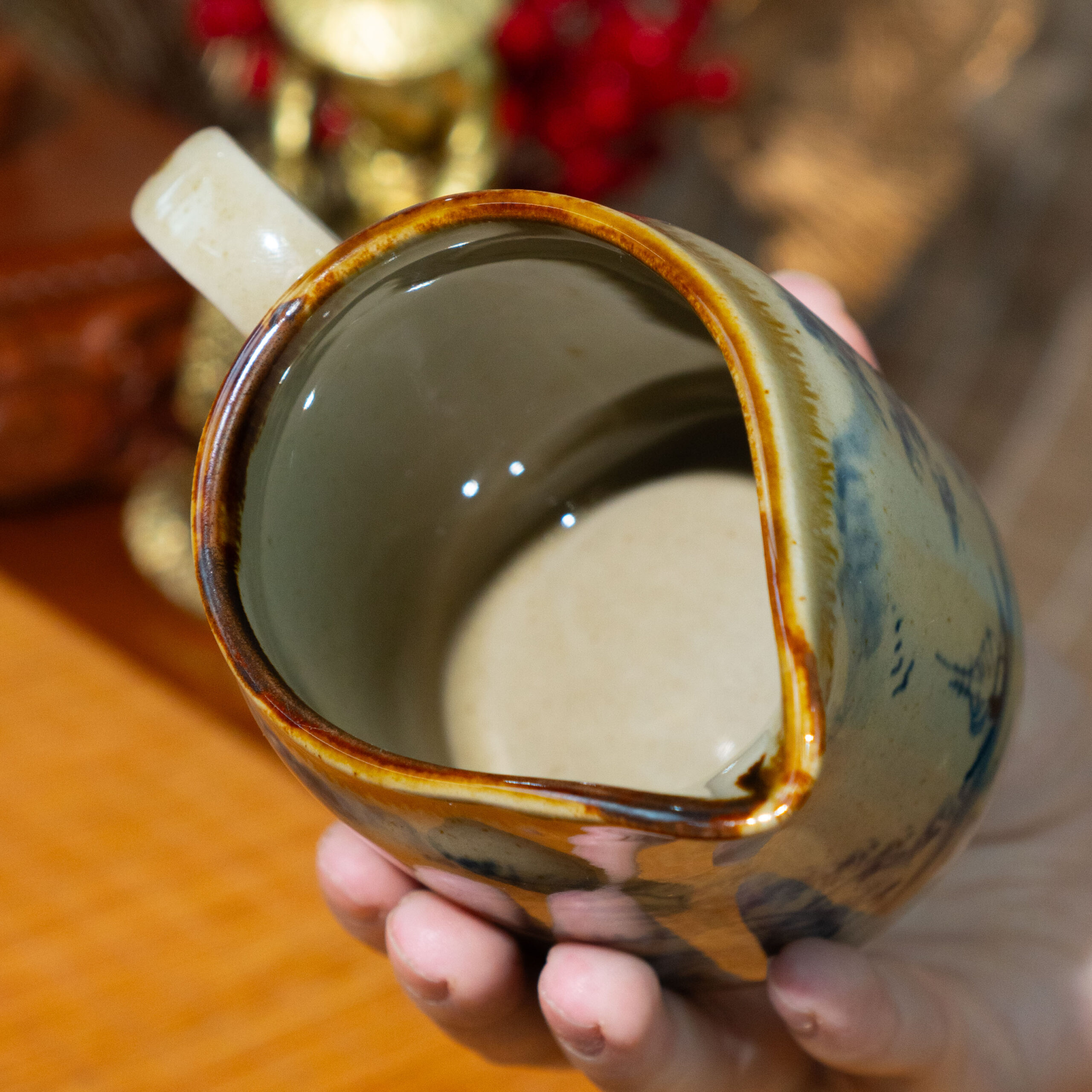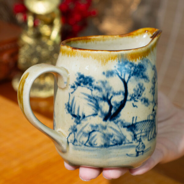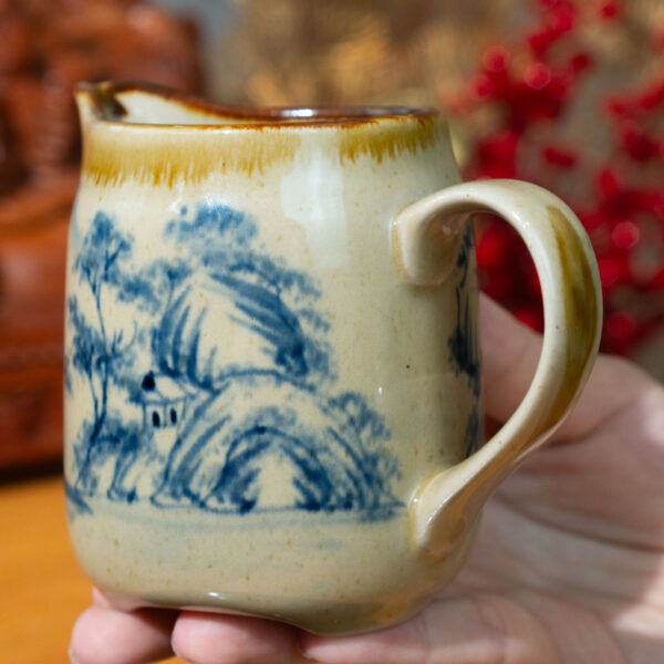 - Chất liệu và màu sắc: Tống trà được làm từ đất sét cao cấp, nung ở nhiệt độ cao (khoảng 1200-1300°C), tạo nên độ bền chắc và khả năng giữ nhiệt tốt. Lớp men trắng ngà bóng mịn phủ bên ngoài làm nổi bật họa tiết xanh lam, kết hợp với viền vàng nâu ở miệng và quai cầm, tạo nên vẻ sang trọng và cổ điển. Màu sắc hài hòa giữa trắng ngà, xanh lam và viền vàng nâu mang lại cảm giác ấm áp nhưng không kém phần tinh tế.
