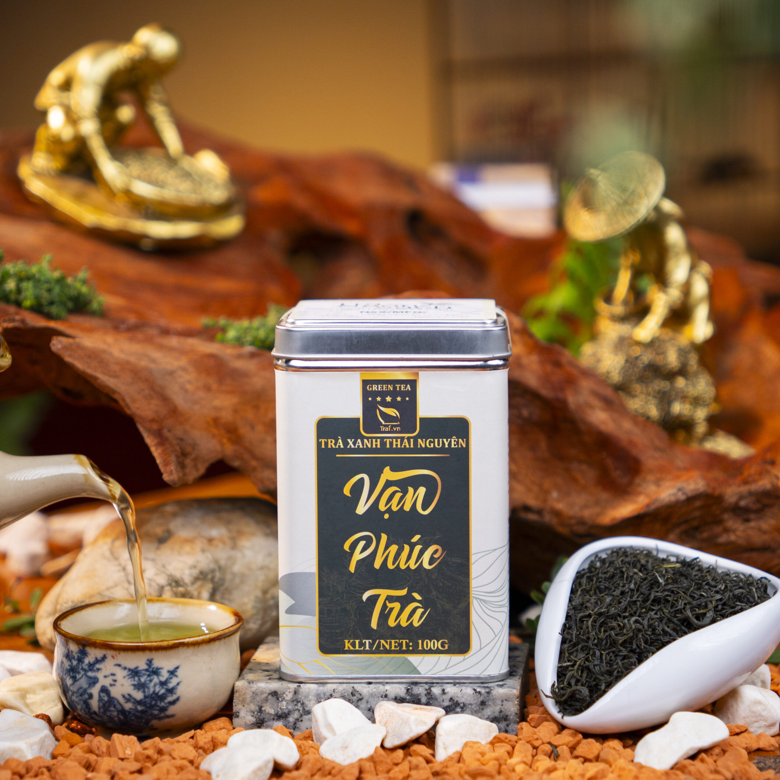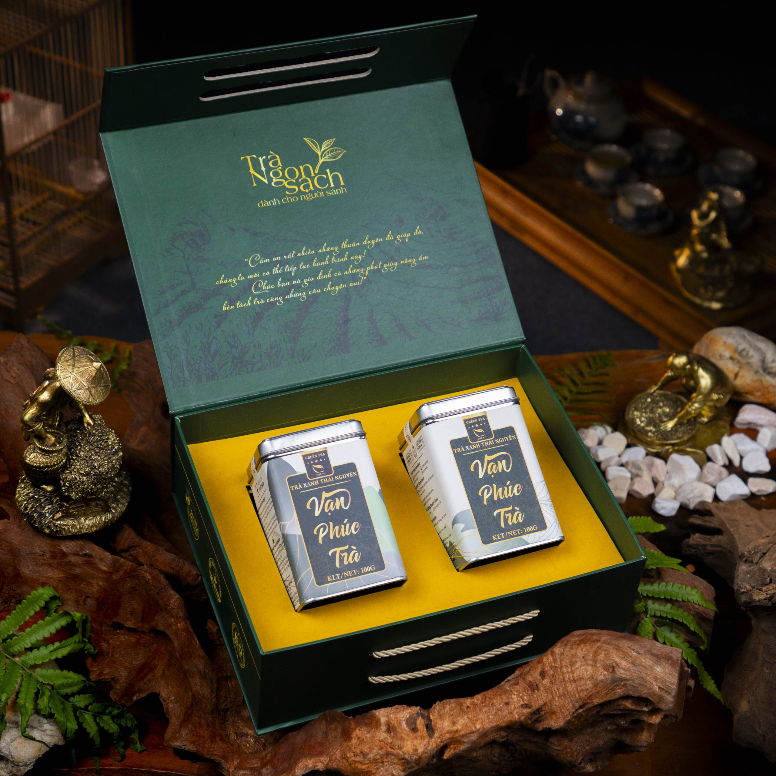 • Hộp thiếc đựng trà: Các hộp được làm từ thiếc cao cấp, màu xanh xám thanh lịch, tượng trưng cho sự an lành và bền vững. Hộp có thiết kế hình chữ nhật đứng, bo tròn nhẹ ở các cạnh, tạo cảm giác mềm mại nhưng hiện đại. Mặt trước in nhãn “Trà Xanh Thái Nguyên – Vạn Phúc Trà” với dòng chữ vàng ánh kim nổi bật, mang lại vẻ ngoài tinh tế và trang nhã.