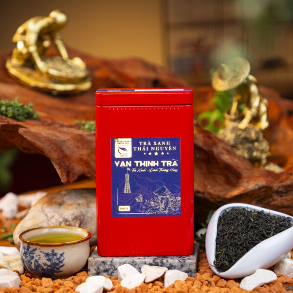 - Hộp thiếc đựng trà: Các hộp được làm từ thiếc cao cấp, màu đỏ tươi nổi bật, tượng trưng cho sự may mắn, thịnh vượng và thành công. Hộp có thiết kế hình chữ nhật đứng, bo tròn nhẹ ở các cạnh, tạo cảm giác mềm mại nhưng hiện đại. Mặt trước in nhãn “Trà Xanh Thái Nguyên – Vạn Thịnh Trà” với hình minh họa đồi chè và người nông dân đội nón lá, gợi lên hình ảnh truyền thống của vùng đất Thái Nguyên.